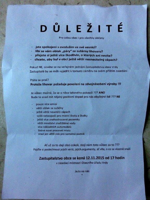 V poště se mi ocitl leták, upozorňující na zastupitelstvo obce, které se bude konat ve čtvrtek 12.11.2015. Jsem ráda, že se ve vsi probudil i někdo jiný a burcuje lidi k tomu, aby se ozvali proti záměru lihovaru zdvojnásobit výrobu.